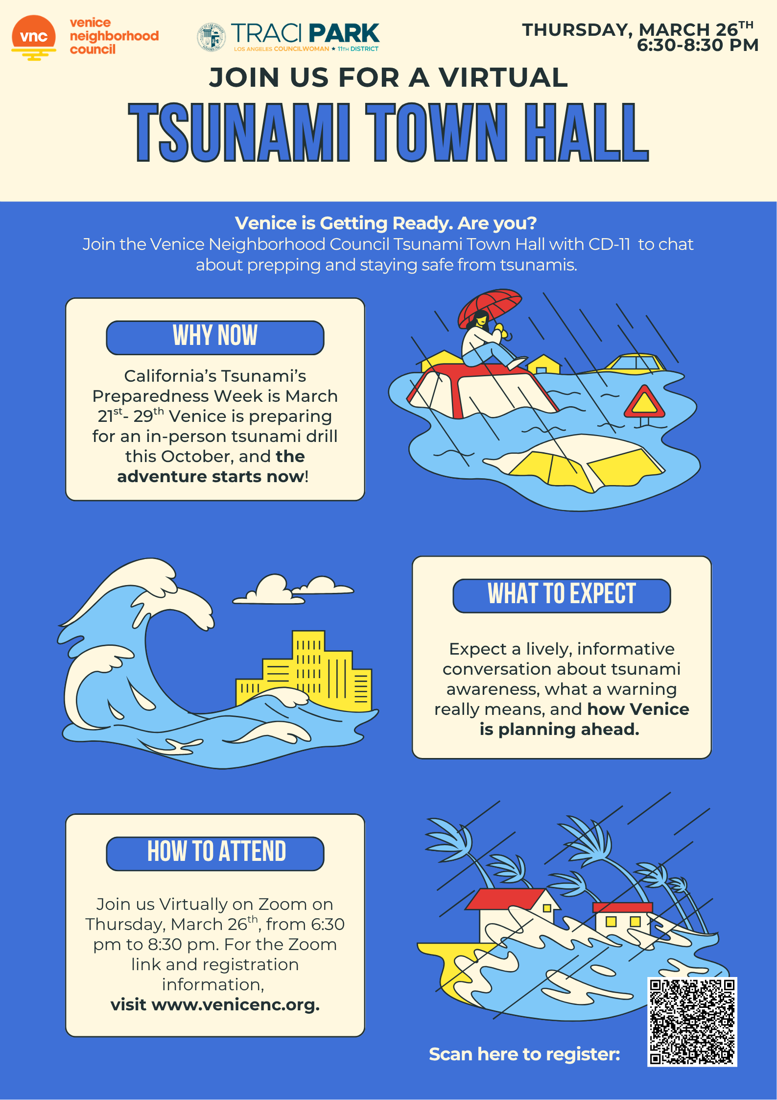 Zoom in with us for a lively, informative conversation about tsunami awareness, what a warning really means, and how Venice is planning ahead. Hear from experts, ask questions, and learn what to expect as we move toward a first-of-its-kind community drill later this year.